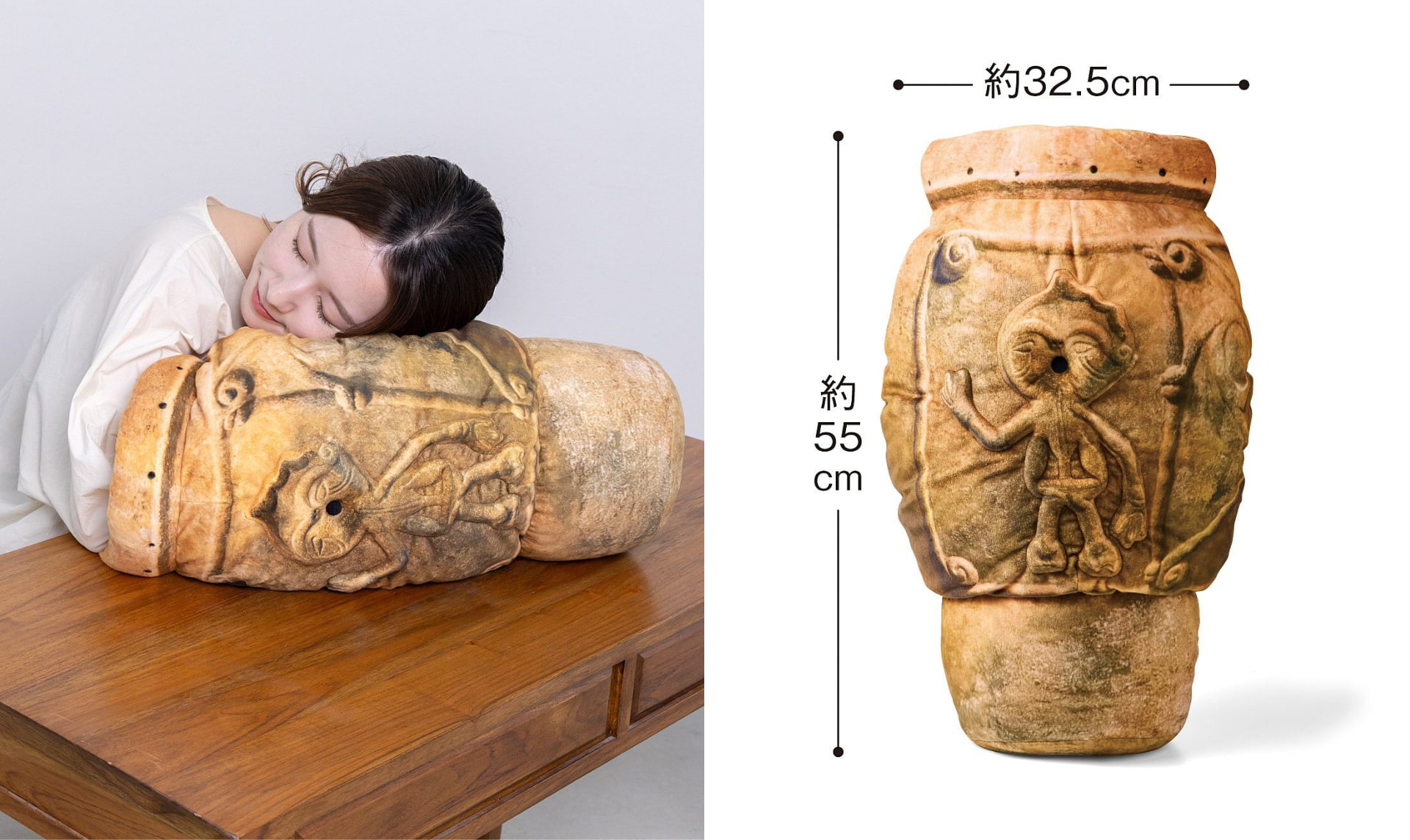 ソックスにもなった「人体文様付有孔鍔付土器」をほぼ原寸大(!)で表現した腕まくらクッション。うたた寝するのにちょうどいいかたちとサイズ感。クッションの中に腕を入れられます。