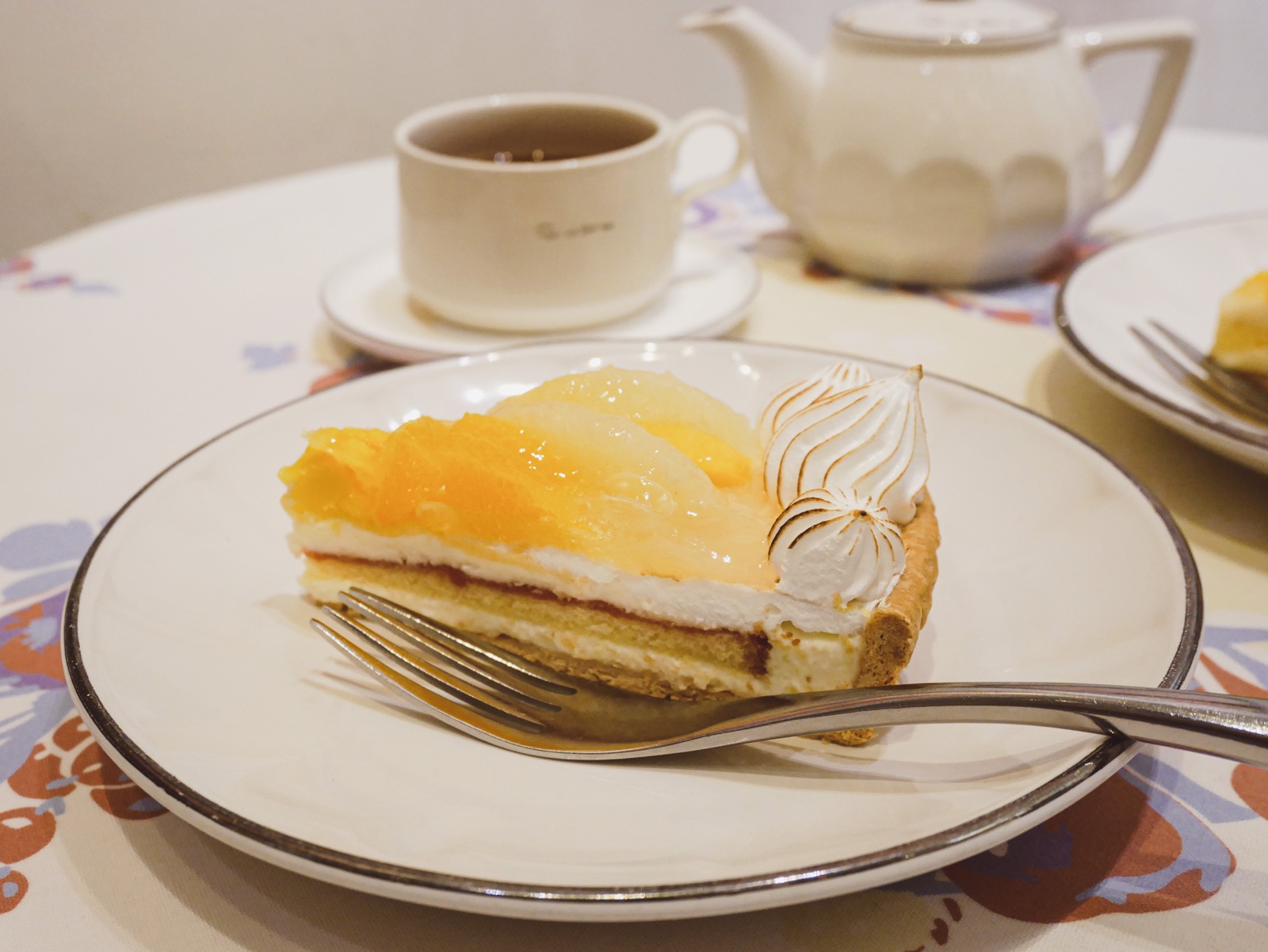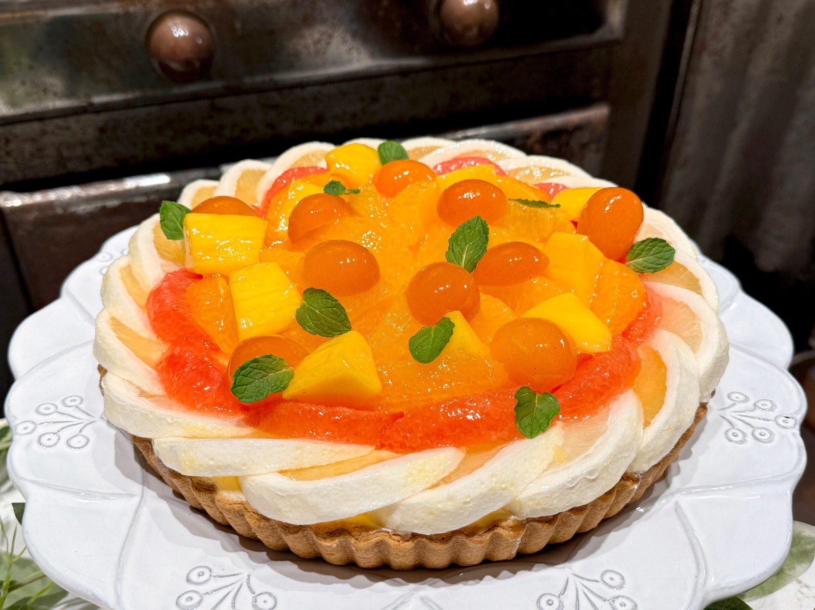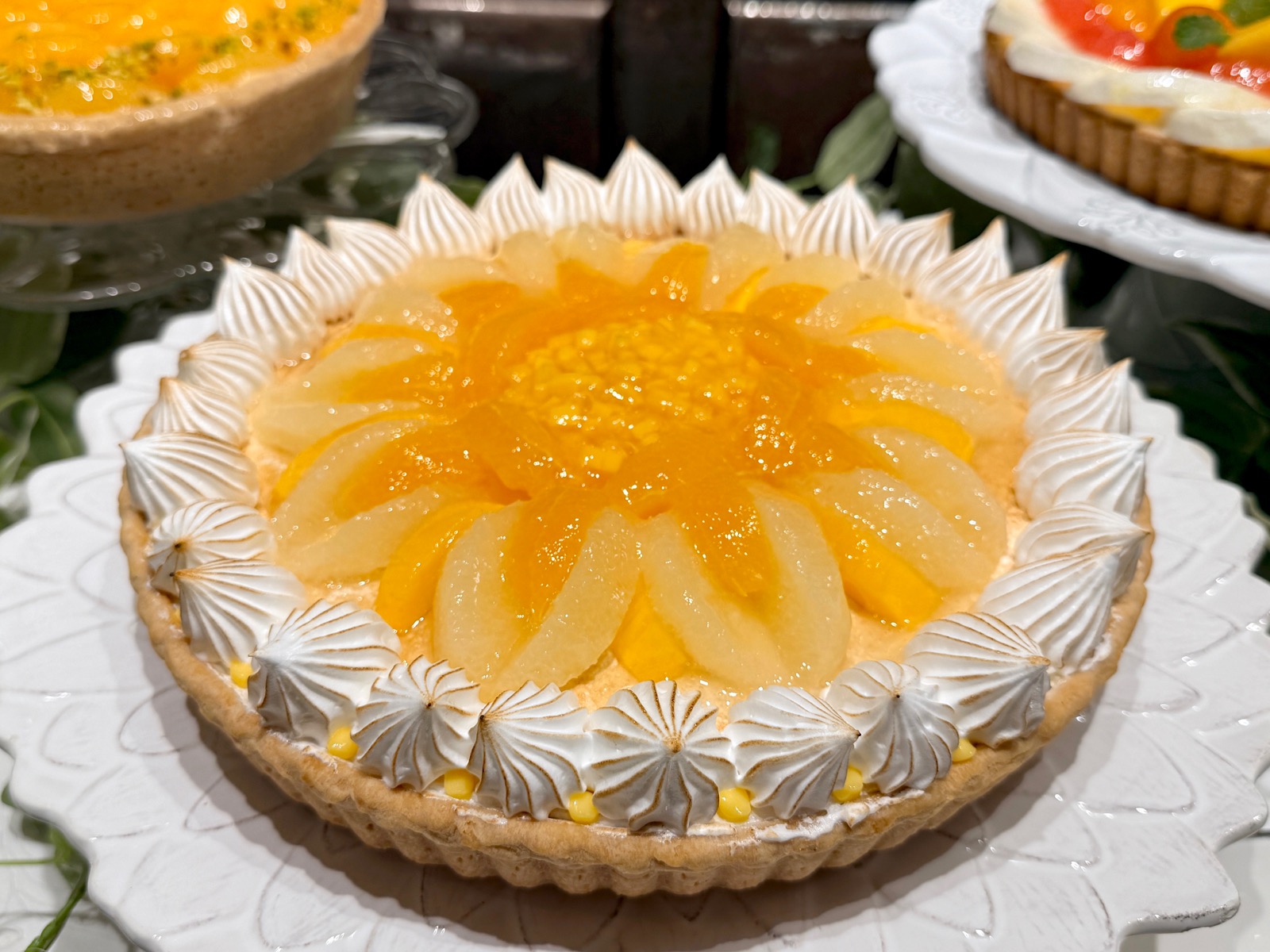 こちらはグレープフルーツとオレンジの爽やかさとマンゴーのまろやかな甘さに、レアチーズのコクが楽しめるタルト。鮮やかなオレンジにイタリアンメレンゲのおめかしが可愛い♡
