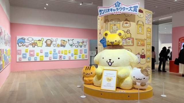 特別展示となるサンリオキャラクター大賞コラボレーションコーナーも見応えたっぷり。2025年度1位に輝いたポムポムプリンがセンターでお出迎えしてくれました。 チームプリンもカワイイ〜!