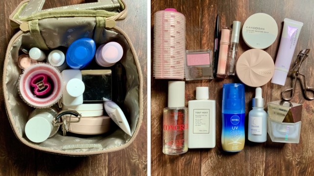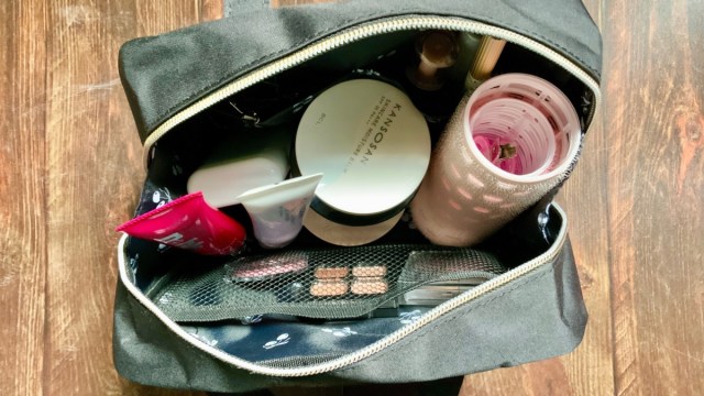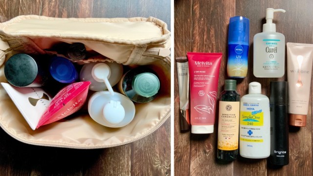 サイズは(約)高さ14×幅15×マチ15cm。最低限のコスメや背が低いボトル&チューブ、日焼け止めなどが入って、旅行の荷物をコンパクトにまとめたいときに最適です。