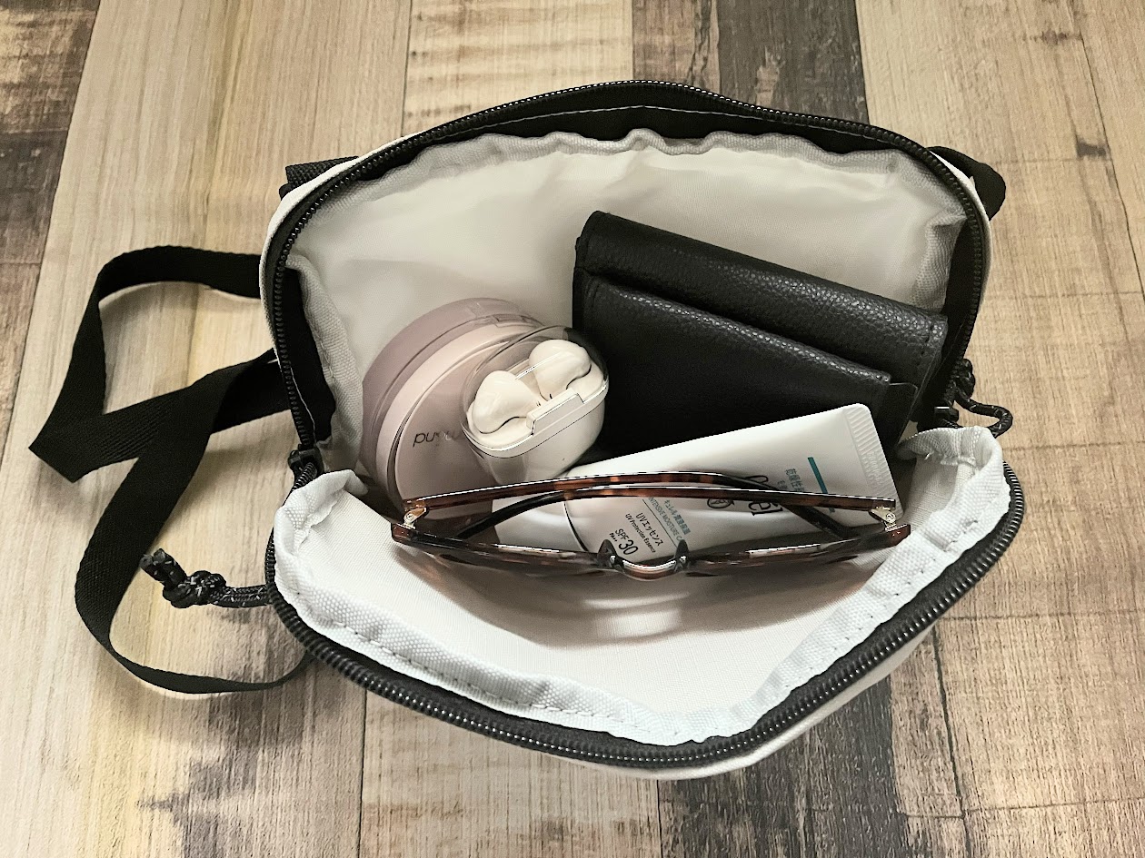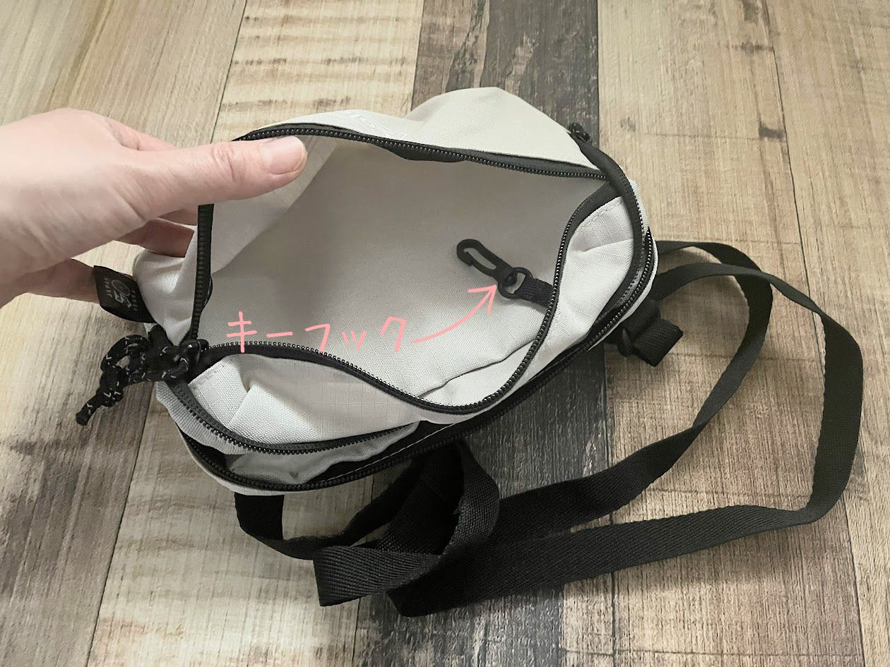 本体には、ミニ財布・イヤホン・サングラスがまるっと収まるうえに、リップなどちょっとしたコスメも入ります。前ポケットはスマホを入れるのにちょうどよく、カギを装着できるキーフックまで装備しているの。