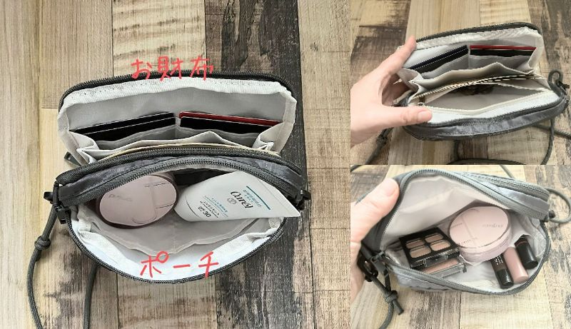 財布部分は大きく開くので見やすく取り出しやすいし、小銭入れ広くていい感じ。ポーチ部分もかなり容量があり、ファンデやリップはもちろん、日焼け止めやチーク、アイシャドウなども収まっちゃいました。ショルダー紐は取り外しが可能で、財布やポーチ単体としても使えます。