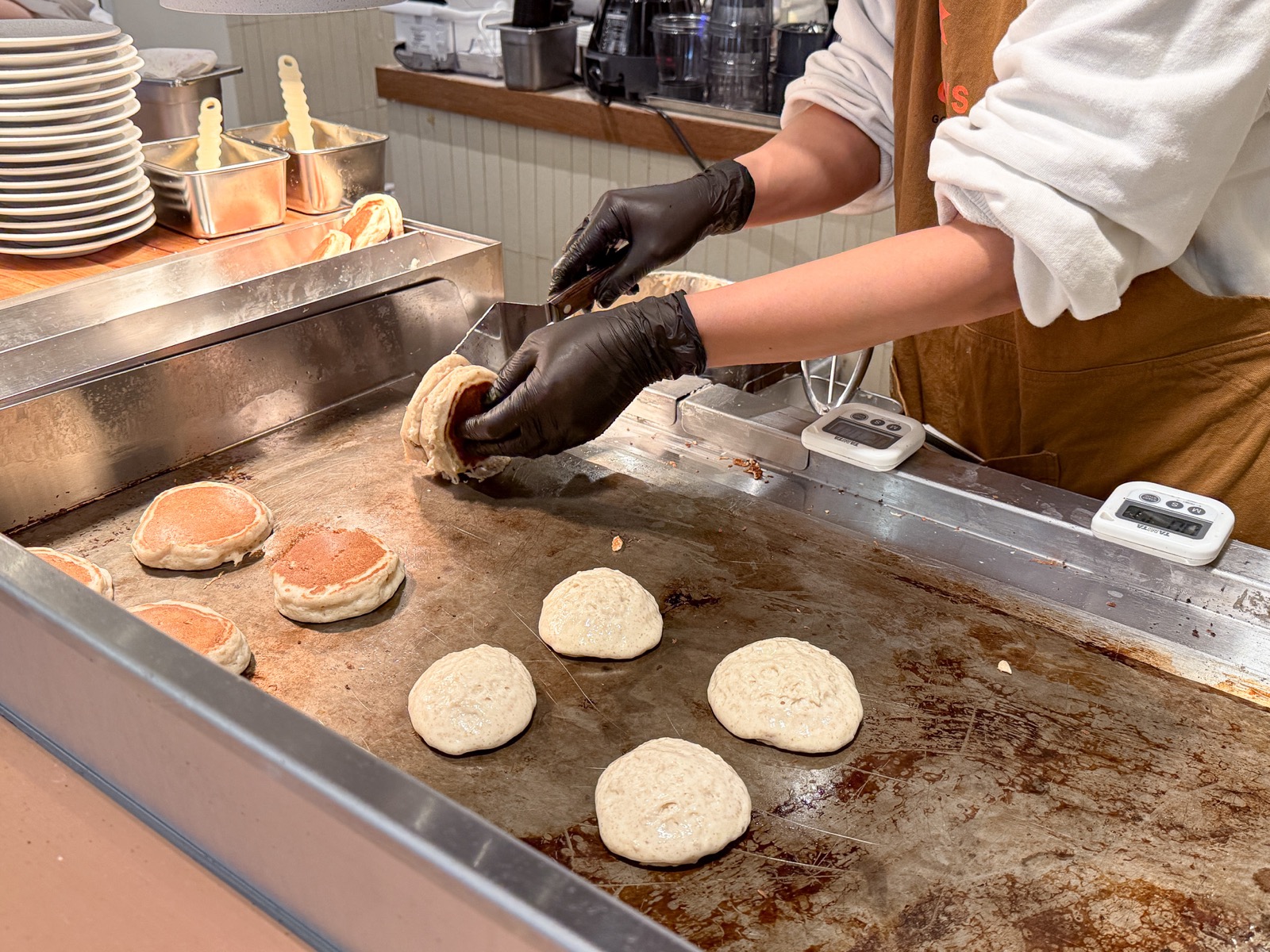 店内の「パンケーキバー」では、目の前の鉄板で1枚ずつ焼き上がる様子が見られました。いい匂〜い!