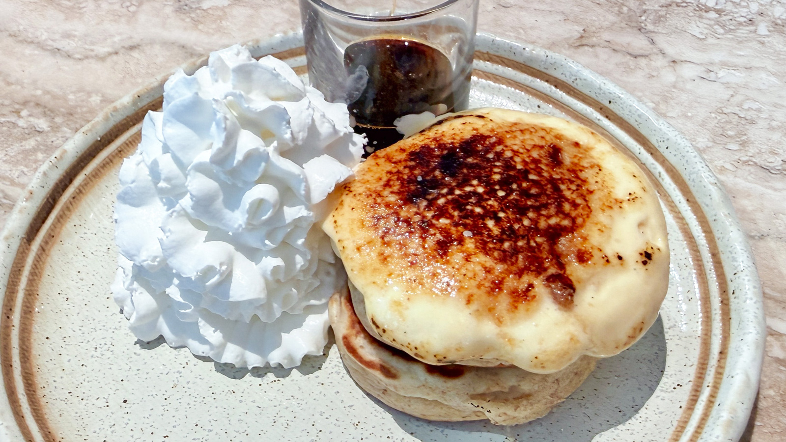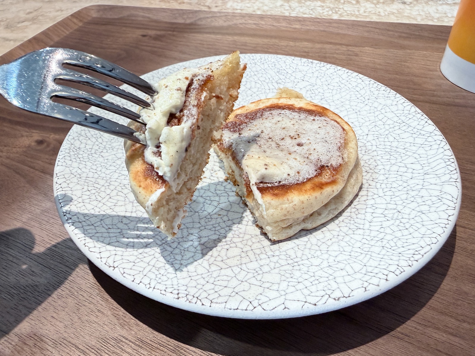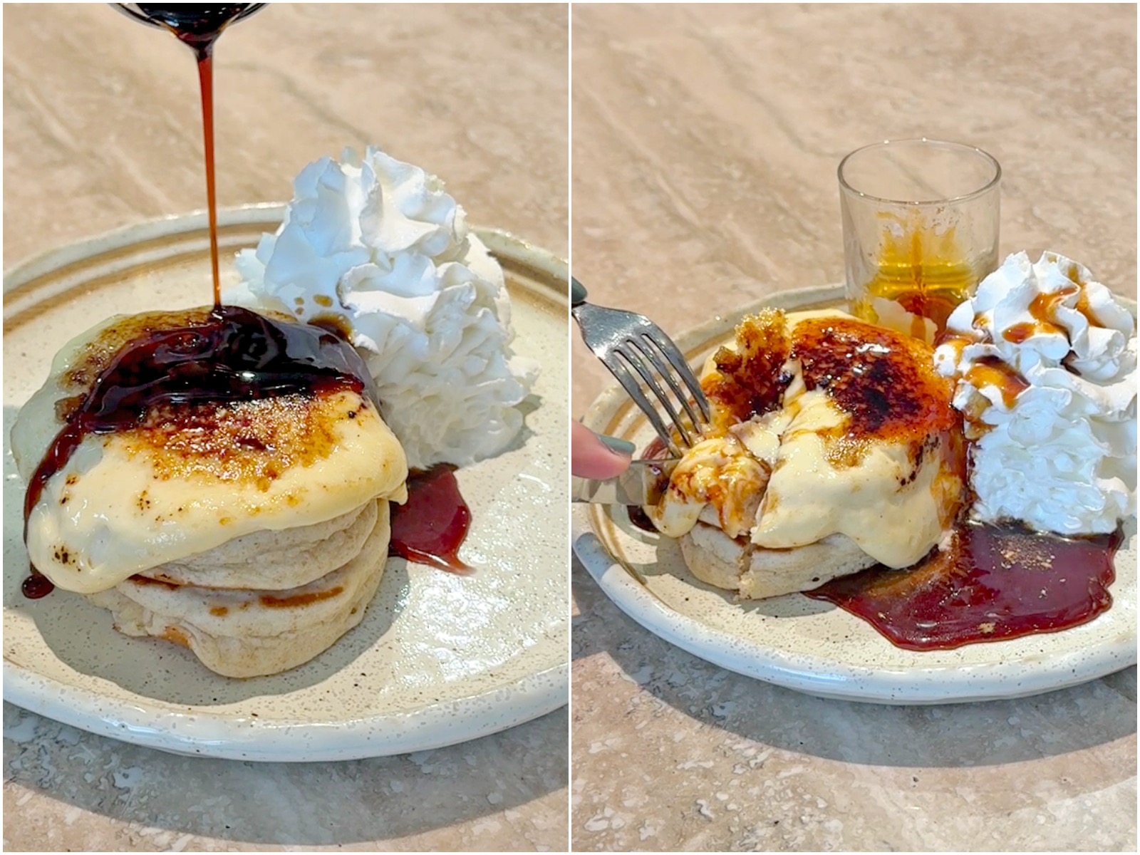 さらにスイーツ系として、カリカリキャラメリゼが魅惑のブリュレパンケーキ(880円)をチョイス。ひとりでも無理なく食べ切れるサイズ感がうれしい〜! ゴージャスだけどフワッと軽い、ちゃんと満足できる理想のハワイアンパンケーキでした。