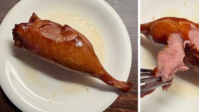 購入したのはフードリエの「紅茶鴨スモークレッグ」。真空パックの個包装で、電子レンジまたは湯煎で温めOK。