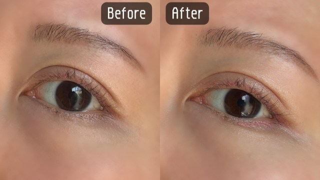 さっそくやってみると、こちらも上アイラインと同じくブラックやブラウンを使ったときのような「メイクしました」感はありません。にもかかわらず、目の輪郭が広がって大きな目に見える効果あり!