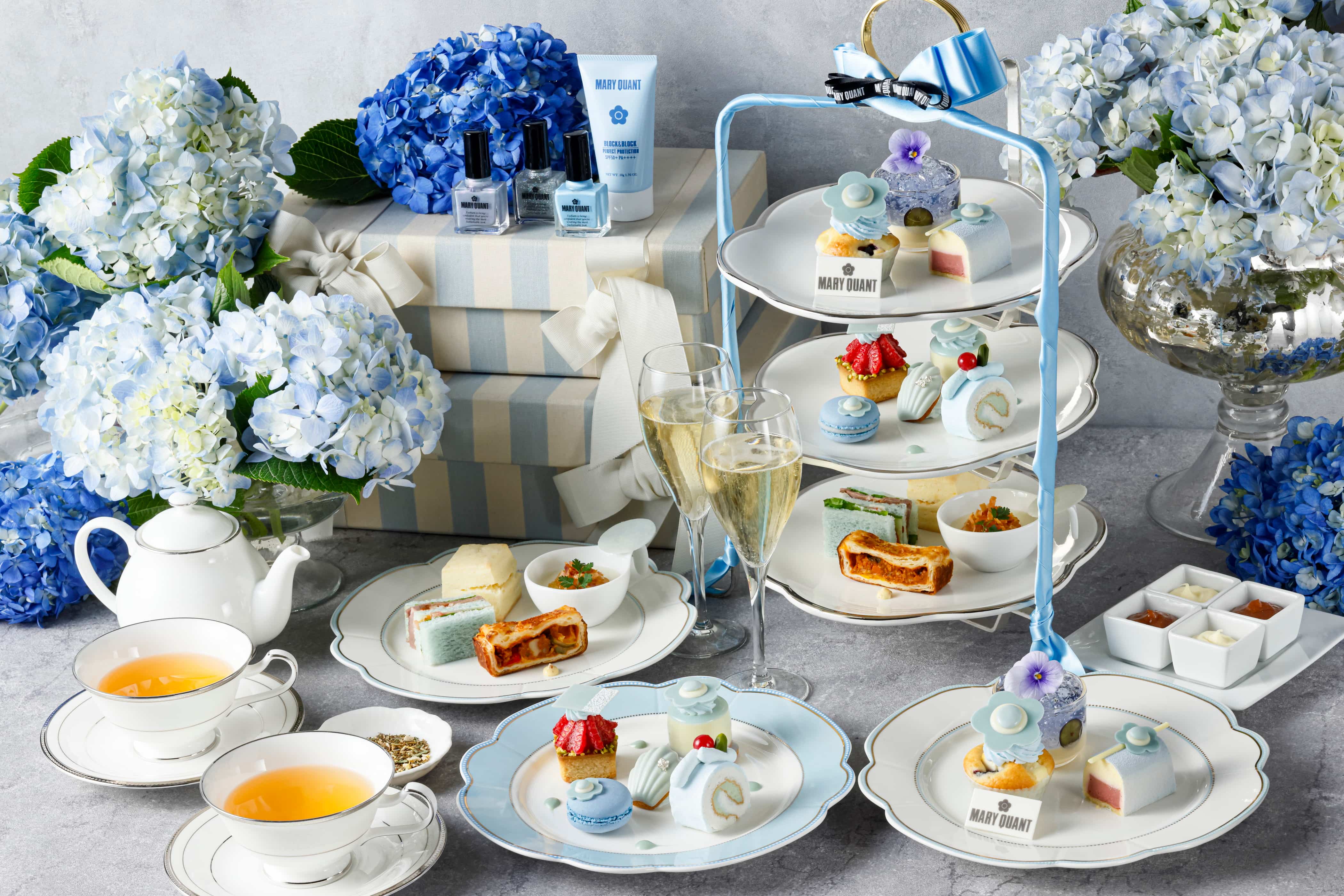 5月に発売されるマリークワント新作「MIZUIRO COLLECTION」から着想を得たコラボアフタヌーンティー。ブランドの象徴である「デイジー」と「紫陽花(あじさい)」をイメージした、ブルー×パールホワイトのスイーツが並びます。