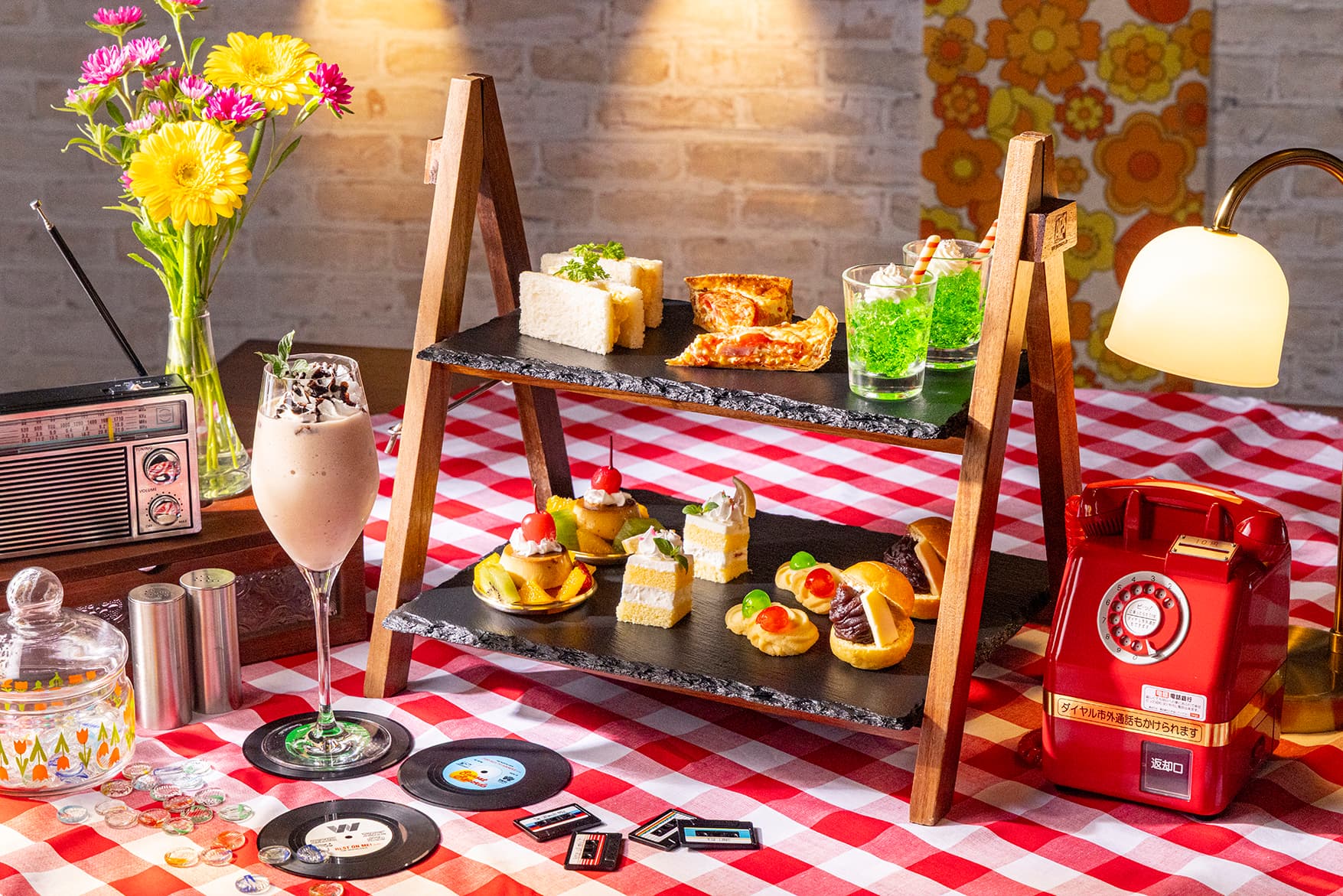 ミニプリンアラモードやメロンソーダをイメージしたゼリーといったスイーツのほか、喫茶店のたまごサンドやナポリタンのキッシュ(!)といったセイボリーも堪能できます。さらにオプションメニューには「レトロ仕立てのバナナクッキーシェイク」や「シャンパン」を用意しているのだとか。