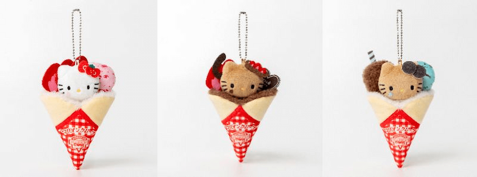 ぬいぐるみチャームのラインナップは、マリオンクレープで特に人気があるという「いちごスペシャル」「いちごチョコショコラ」「チョコミントクッキー」の3種類。よく見たら、マリオンクレープのシンボルである赤いギンガムチェックの包み紙まで再現してるう!