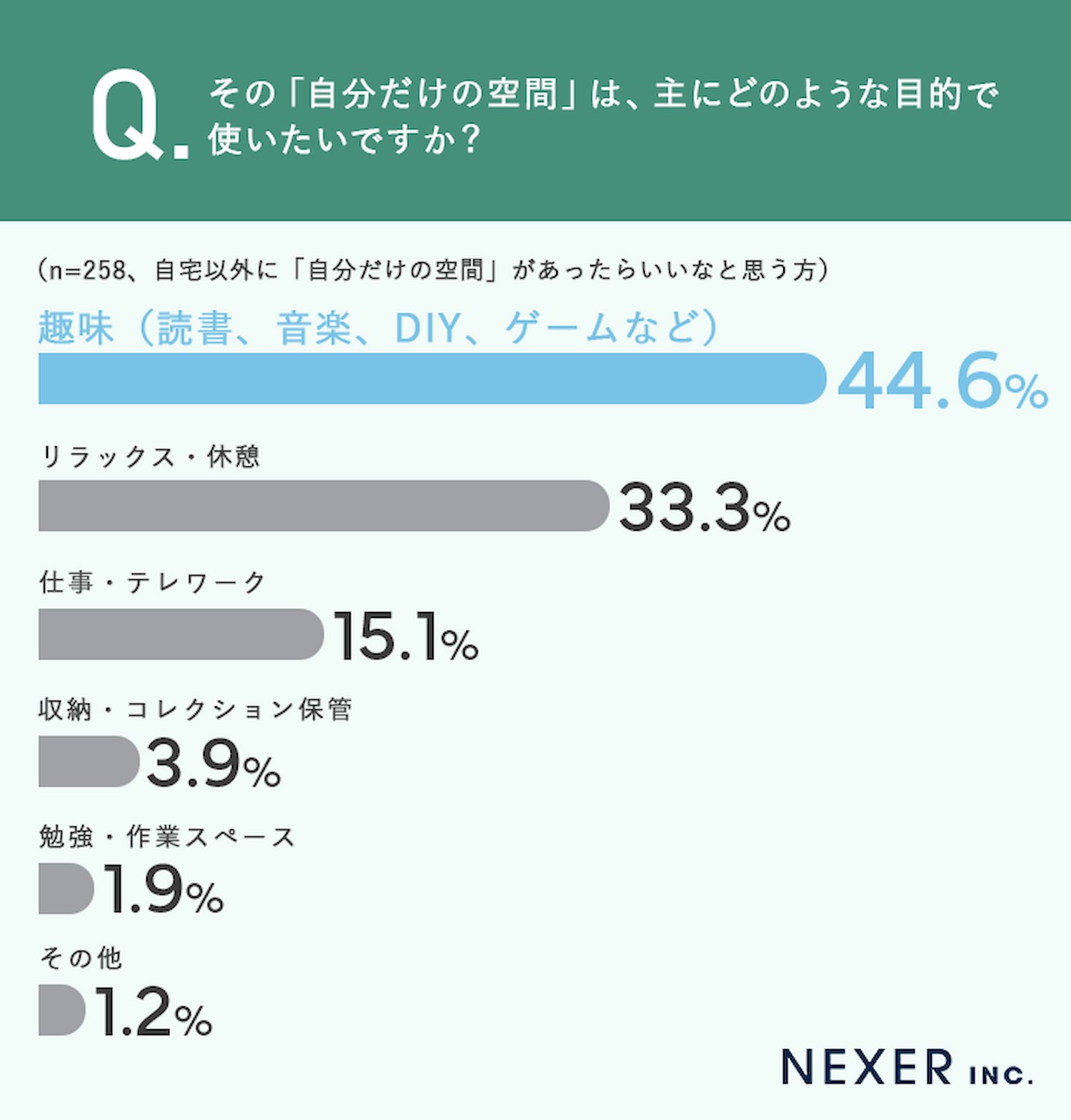 ある調査によれば、約半数が「自宅以外に “自分だけの空間” があったらいいなと思ったことがある」と回答していました。どんな目的で使いたいのか、その理由を聞いてみたところ……?