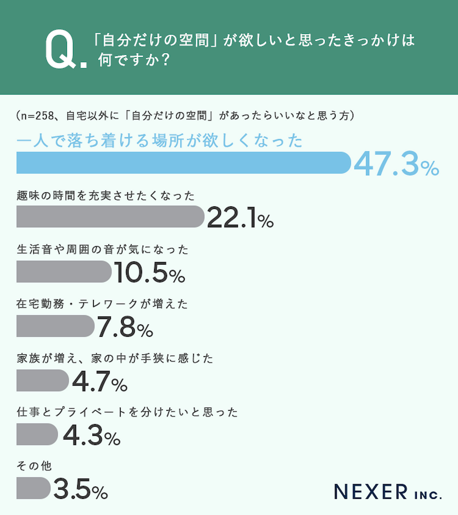 ちなみに、自分だけの空間が欲しいと思ったきっかけ第1位は「一人で落ち着ける場所が欲しくなった」でした。さて、あなたはこの結果をどう思う?