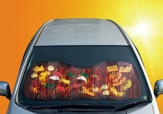 真夏の車内って灼熱すぎて、フロントガラスでバーベキューできそうじゃない? そんな発想から生まれた車用サンシェード。お肉や野菜などがジュウジュウ焼かれたインパクト満点のデザインは、広い駐車場でもひと目で自分の車を見つけられそう!