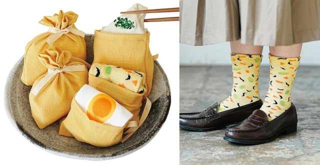 油あげを再現したちりめん風素材の巾着に、〈おもち〉〈煮卵〉〈五目〉の3種類の具材ソックスが詰め込まれています。具材それぞれの特徴をとらえたイラストや風合いのデザインに注目♪ ファッションのアクセントとして足元を可愛く彩ってくれそうです!