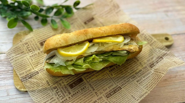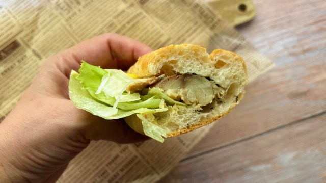 かぶりついてみると、味もゴージャス。脂が乗った旨味たっぷりのサバとレモンのさわやかな酸味が相性抜群でたまらん~~~!!! シャキシャキの玉ねぎやレタス、素朴なフランスパンが、サバのおいしさを見事に引き立てています。