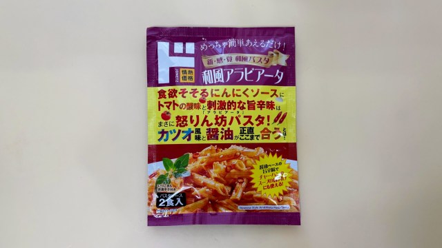 ドン・キホーテのプライベートブランド「情熱価格」から出ている「和えるパスタ和風アラビアータ」。
