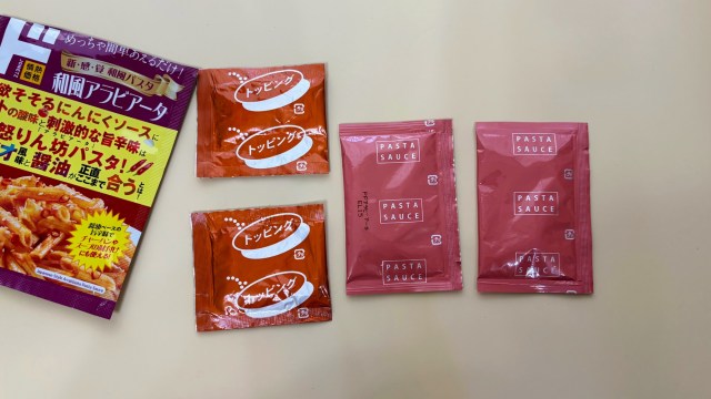 1袋2食分で、中にはパスタソースの小袋といりごま&赤唐辛子の小袋がそれぞれ2袋ずつ入っていました。