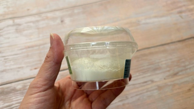 フタを開けると、丸いお餅のようなわらびもちが4つ。そのうえに、粉雪のように真っ白なココナッツパウダーがたっぷりかかっています。
