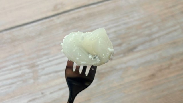 おおぉ、食感はたしかにわらびもち! もちっとしているものの、お餅とひと味違うのが、ぷるんとした弾力感とつるんとした喉ごしです。原材料を見ると本わらび粉は使われていないようですが、ちゃんとわらびもちらしさが再現されています。
