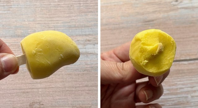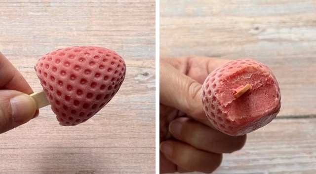 ただし、断面を見てみると「3Dフルーツアイス」は外側がチョコでコーティングされているのに対し、「3Dフルーツポップス」はチョコのコーティングはなし。ソルベ状のアイスだけの構成になっている点に、わずかな違いが見られました。