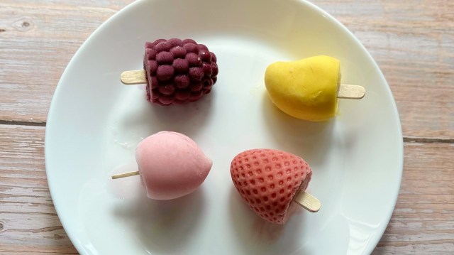 紙製の箱を開けて中身を見てみると、たしかにかなりのミニサイズ! でも、ちゃんとそれぞれのフルーツをかたどった形状になっているし、アイスには小さなスティックも付いています。