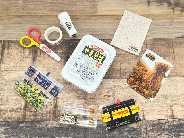 付録の名前はずばり「本物そっくり! ペヤング ソースやきそば 超豪華! 文具9点セット」です。どこもかしこもペヤングすぎて「なんじゃこりゃ(笑)」となるいっぽう、意外と実用的でもありました。